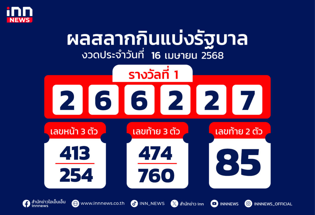 ผลสลากงวด 16 เมษายน 68 รางวัลที่ 1 คือ 266227 สองตัว 85