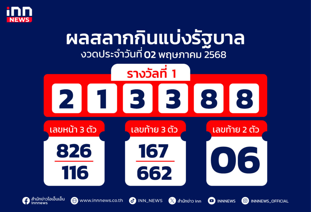 ผลสลากงวด 2 พฤษภาคม 68 รางวัลที่ 1 คือ 213388 สองตัว 06