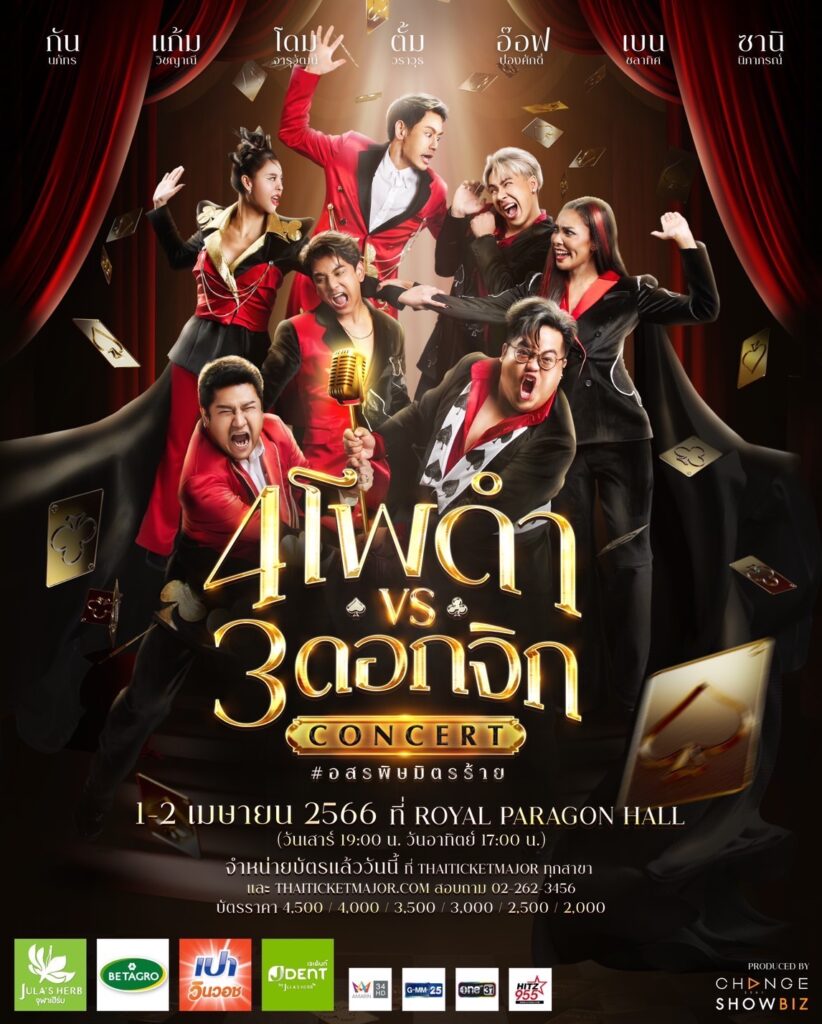 นับเป็นปรากฏการณ์กระหึ่มโลกโซเชียลทีเดียว !! กับการรวบรวม 7 สุดยอดศิลปินมาไว้ในคอนเสิร์ตที่เจอ จ่าย จบ !! (เจอกันที่คอนเสิร์ต จ่ายด้วยความฮา จบทุกความเครียด) กับคอนเสิร์ตที่แซ่บที่สุดแห่งปีใน “คอนเสิร์ต 4 โพดำ ปะทะ 3 ดอกจิก” #อสรพิษมิตรร้าย พร้อมจัดเต็มความสนุกสนานเต็มคาราเบล จาก 2 แก๊งที่แสบเสมอกัน ระหว่างแก๊งรุ่นพี่สุดเก๋าจากเดอะสตาร์ “4 โพดำ” กัน นภัทร , แก้ม วิชญาณี , โดม จารุวัฒน์ และ ตั้ม วราวุธ มาปะทะ แก๊งรุ่นน้องตัวตึงที่อยากเดบิวต์เป็น “3 ดอกจิก” อ๊อฟ ปองศักดิ์ , เบน ชลาทิศ และ ซานิ นิภาภรณ์ ที่พร้อมฟาดกันด้วยเสียงร้องทรงพลังกับเพลงที่ขนกันมาหมดคลังแสง และฝีปากที่ลับกันมาอย่างคมกริบสุดเผ็ดร้อน พร้อมกรี๊ดกับเพลงเพราะสุดประทับใจ ฮาน้ำตาเล็ดไปกับช่วงทอล์กสนุกกับโชว์สุดว๊าว !!! การันตีความประทับใจทั้งหมดจาก CHANGE Showbiz กับ Production ฉาก เวที แสง สี เสียง อลังการ แบบเต็ม 10 ไม่หัก