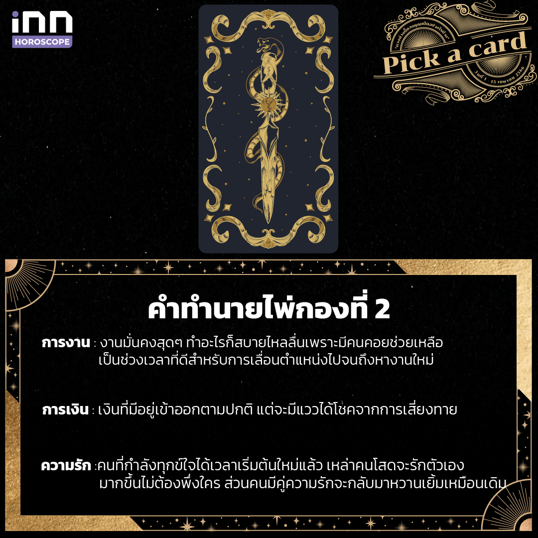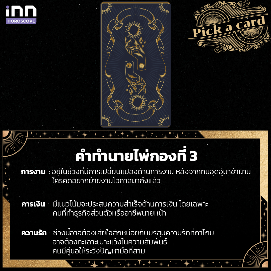 ไม่ว่าจะหยิบหรือเลือกกองไหน สำคัญที่สุดคือเตือนตัวเอง มีสติกับการใช้ชีวิต เพื่อที่จะผ่านเรื่องราวต่างๆ ในช่วงนี้ ถ้าใครที่มีความชอบในการอ่านดวง อยากเสริมดวง เสริมโชคลาภในรูปแบบอื่นๆ สามารถติดตามได้ที่นี่ iNN Horoscope