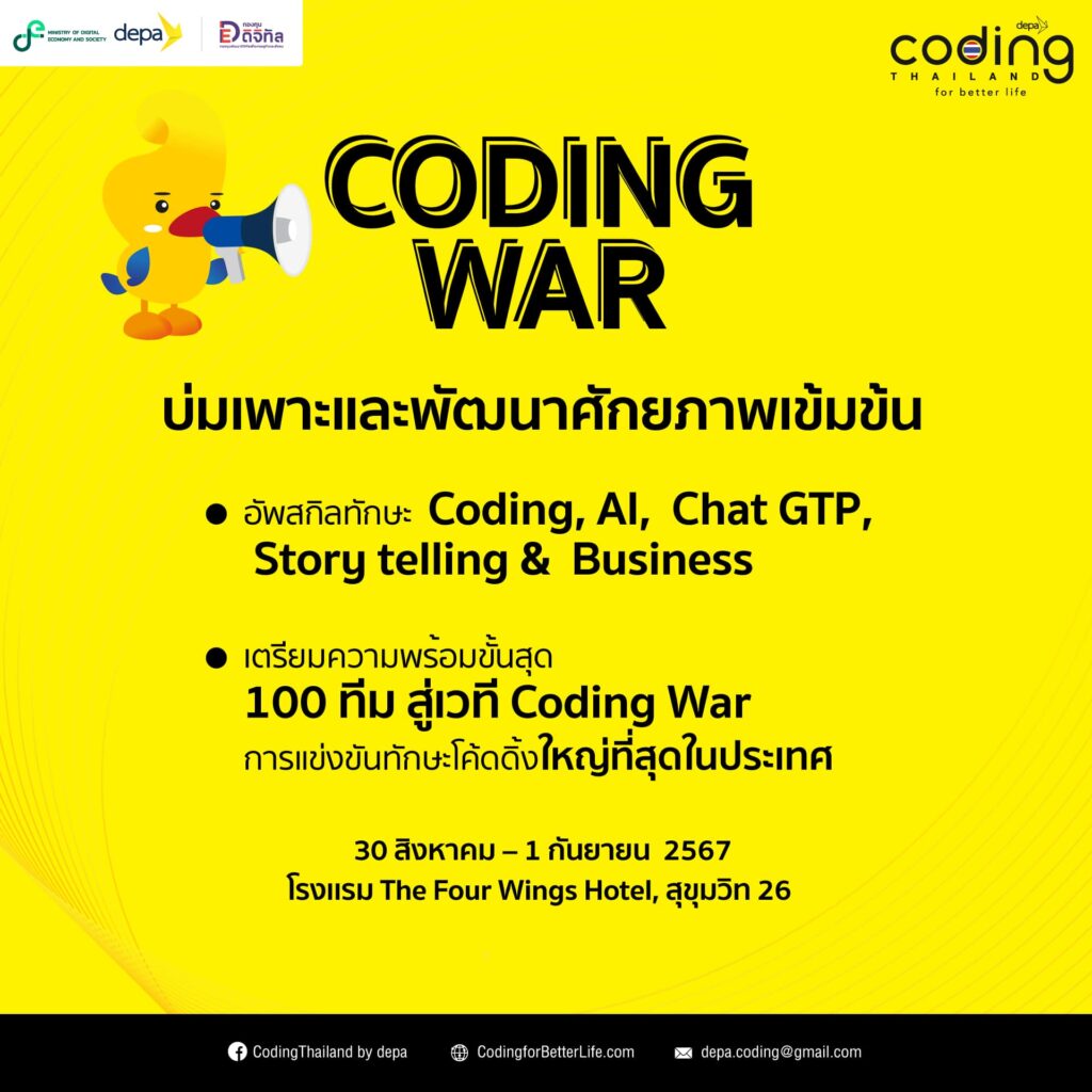 ดีป้า จัดกิจกรรมพัฒนาศักยภาพเข้มข้น ครู – นักเรียน จำนวน 100 ทีม ที่ผ่านการคัดเลือกอย่างเข้มข้น จากทั่วประเทศ เข้าคอร์สติวเข้มทักษะโค้ดดิ้ง จากผู้เชี่ยวชาญ ฝึกนำเสนอผลงานและรับข้อเสนอแนะ ก่อนร่วมประชันไอเดียเพื่อชิงความเป็นหนึ่งบนเวที Coding War เวทีแข่งขันทักษะโค้ดดิ้งที่ใหญ่ที่สุดของประเทศไทย ภายใต้โครงการ Coding for Better Life