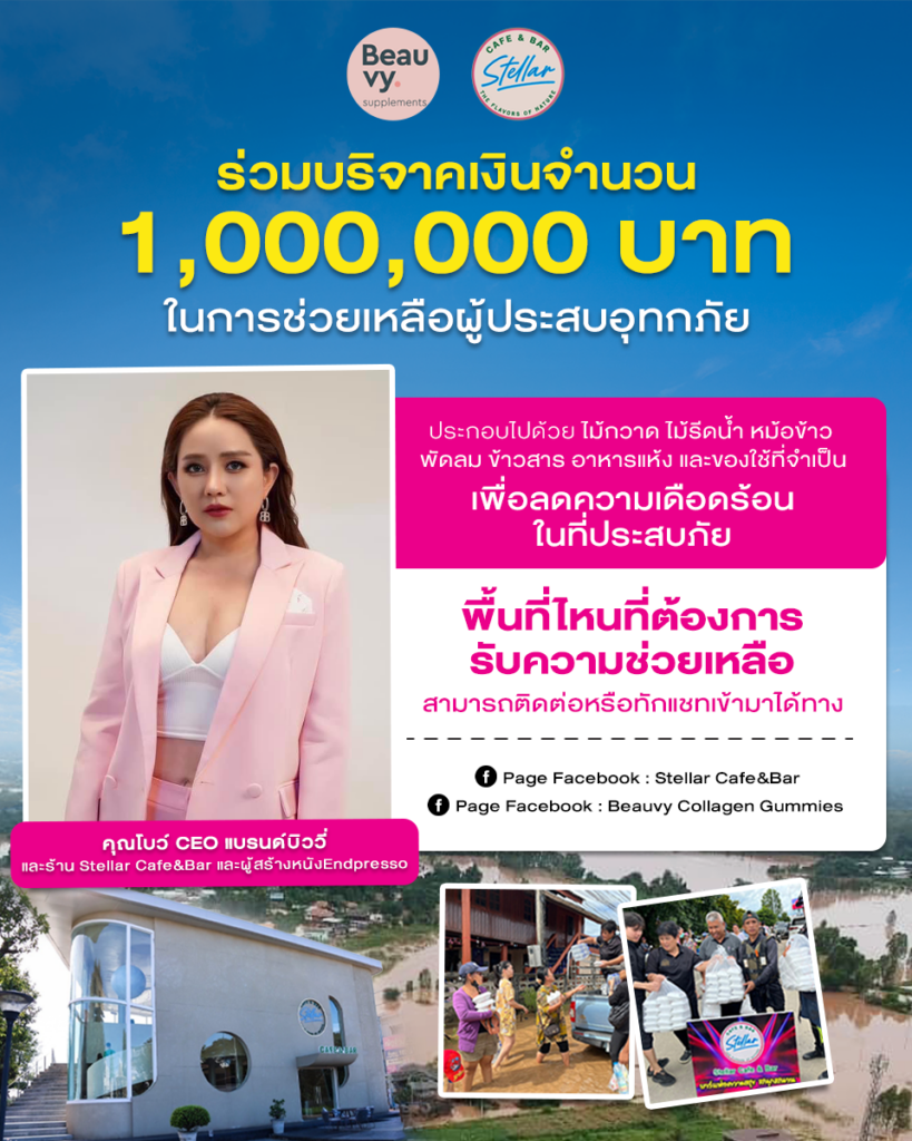 ด้วยสถานการณ์น้ำท่วมภาคเหนือที่ได้รับผลกระทบและสร้างความเสียหาย โดยเฉพาะในพื้นที่ จังหวัดเชียงราย และมีผู้ประสบภัยยังคงรอคอยความช่วยเหลืออย่างต่อเนื่อง โบว์-กัญธนัช กิตติถิรธรรม “ผู้อำนวยการสร้าง” หนังไทย “ENDPREESO ปณิธานหวานน้อย” และผู้ผลิตอาหารเสริม “บิววี่” จึงไม่รอช้า รีบเข้าช่วยเหลือชาวเชียงรายทันที!!!
