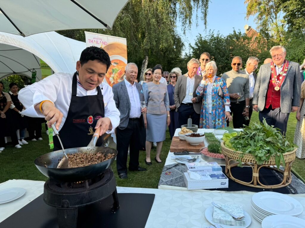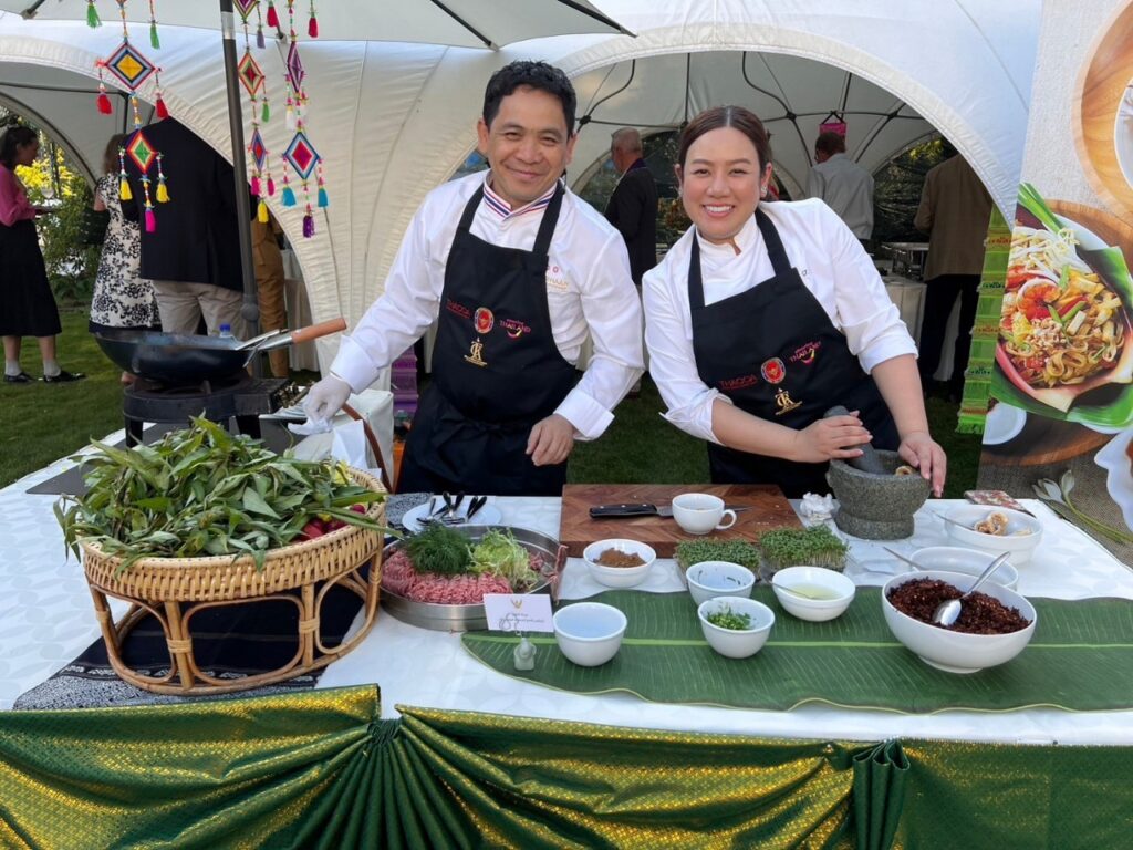 เมื่อวันที่ 22 และ 24 กันยายน ที่ผ่านมา สถานเอกอัครราชทูต ณ กรุงโคเปนเฮเกน จัดงาน Taste of Thailand ณ ทำเนียบเอกอัครราชทูต โดยได้เชิญ เชฟชุมพล แจ้งไพร ประธานอนุกรรมการ Soft Power สาขาอาหาร เจ้าของรางวัลมิชลิน 2 ดาว 5 ปีซ้อน ทำอาหารไทย 5 ภาค เสิร์ฟให้แก่ผู้เข้าร่วมงาน ได้แก่ ข้าวซอยเนื้อจากภาคเหนือ แกงเขียวหวานจากภาคกลาง ผัดหมี่โคราชและส้มตำไก่ย่างจากภาคอีสาน ขนมจีนน้ำยาปูจากภาคใต้ เส้นจันทน์ปูจากภาคตะวันออก ข้าวเหนียวมะม่วง ขนมหม้อแกง ขนมชั้น ขนมปังหน้ากุ้ง ข้าวตังหน้าตั้ง พร้อมสาธิตการประกอบอาหารไทยเมนูลาบคั่ว