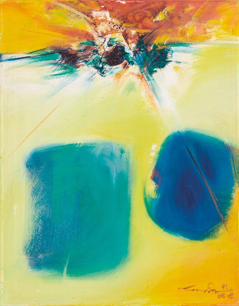 ลงชื่อและวันที่ “ดำรง 1961” (มุมขวาบน); ลงชื่อ จารึก และวันที่ “Damrong W 1961 Bangkok” (ด้านหลัง) สีน้ำมันบนกระดาน