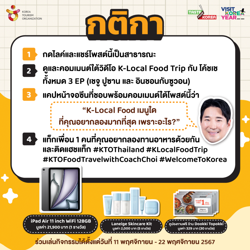บอกลาทริปสุดพิเศษนี้ด้วย Online Event ที่ไม่ควรพลาด! เตรียมตัวให้พร้อมกับการลุ้นรับของรางวัลกว่า 36 รางวัล มูลค่ารวมกว่า 40,000 บาท โดยรางวัลใหญ่สุดคุ้ม iPad Air รุ่น 11 นิ้ว เพียงแค่คุณติดตามชม “K-Local Food Trip กับ โค้ชเช” และร่วมกิจกรรมสนุกๆ ที่ KTO Thailand จัดเตรียมไว้ ตั้งแต่วันที่ 11 พฤศจิกายน – 22 พฤศจิกายน 2024 อย่ารอช้า! มาร่วมเป็นส่วนหนึ่งของการเดินทางที่เต็มไปด้วยรสชาติ ความสนุก และโอกาสลุ้นรางวัลสุดพิเศษไปพร้อมกันกับเราได้ที่ Facebook KTO Thailand (https://www.facebook.com/KTOThailand)