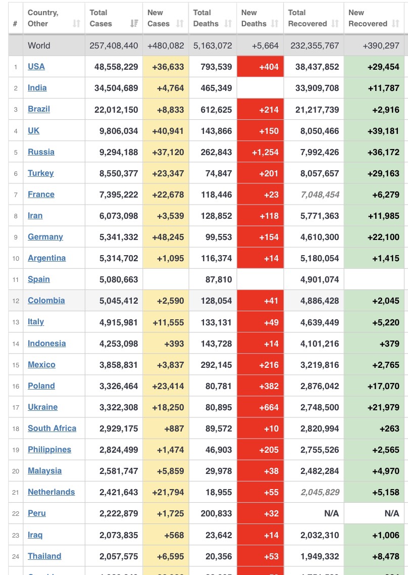 ทั่วโลกติดโควิดกว่า 257.4 ล้านราย เพิ่ม 4.8 แสนราย -ด้านสหรัฐยอดติดเชื้อลดจากเกือบแสนราย พบเหลือ3.6หมื่นรายต่อวัน