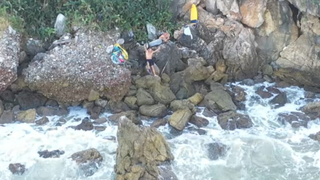 จนท.จึงได้นำอากาศยานไร้คนขับบินขึ้นไปเพื่อตรวจสอบและค้นหานักท่องเที่ยวจนพบและด้วสภาพคลื่นที่แรกจึงใช้วิธีส่งจนท.นำกำลังจำนวนหนึ่งที่มีความชำนานการไต่เขาเลาะข้างเขาลงไป ช่วยนักท่องเที่ยวที่ติดอยู่ขึ้นมาได้จนสำเร็จนักท่องเที่ยว เล่าว่าสาเหตุที่ตนและเพื่อนไปติดอยู่บนหัวเขาขณะเล่นไคท์เซิร์ฟอยู่ในทะเลก็เพราะว่าอุปกรณ์ที่ควบคุมการบังคับร่มเกิดชำรุดใช้การไม่ได้ทำให้ไม่สามารถบังคับร่มให้พานำกลับเข้าฝั่งได้จึงถูกคลื่นลมทะเลพัดเข้าไปติดที่หัวเขา โดยทางเจ้าหน้าที่ฝากเตือนประชาชนและนักท่องเที่ยวว่าในช่วงนี้เข้าสู่ลมมรสุมทะเลมีคลื่นลมแรง ห้ามลงเล่นน้ำทะเลเด็ดขาด