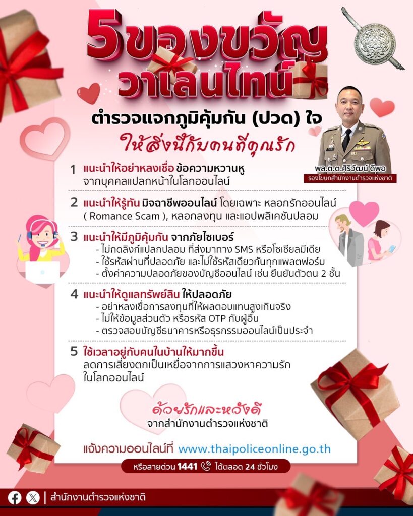 ซึ่งเห็นได้ว่าคนทุกเพศทุกวัย ก็สามารถตกเป็นเหยื่อของอาชญากรรมออนไลน์ได้ ประกอบกับในวันที่ 14 กุมภาพันธ์ 2568 เป็นเทศกาล “วันวาเลนไทน์” จึงขอใช้โอกาสนี้ แนะนำประชาชน ที่ไม่ต้องการเจ็บปวดใจจากความรักที่ไม่สมหวัง ให้หันมาแสดงความรักกับคนในครอบครัว ด้วยการสร้างภูมิคุ้มกันภัยอาชญากรรมทางเทคโนโลยี ซึ่งเป็นภัยคุกคามสำคัญที่สร้างความเสียหายให้กับประชาชนจำนวนมาก