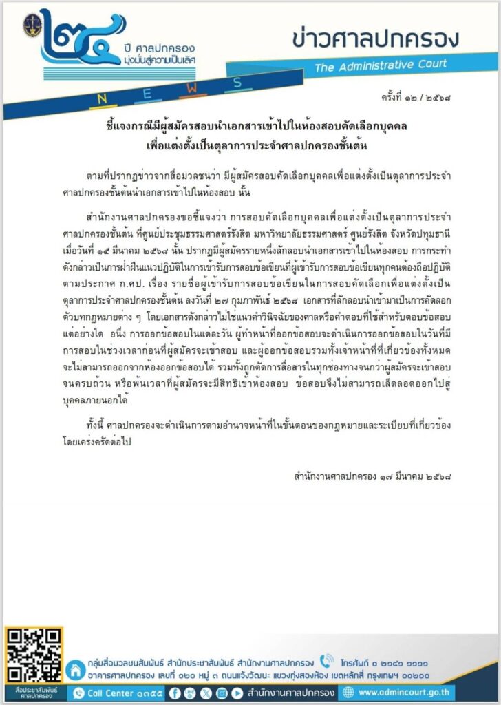 ศาลปกครองสูงสุดชี้แจงกรณีมีผู้สมัครสอบนำเอกสารเข้าไปในห้องสอบคัดเลือกบุคคลเพื่อแต่งตั้งเป็นตลุาการประจำศาลปกครองชั้นต้นซึ่งการสอบคัดเลือกบุคคลเพื่อแต่งตั้งเป็นตุลาการประจำศาลปกครองชั้นต้น ที่ศูนย์ประชุมธรรมศาสตร์รังสิต มหาวิทยาลัยธรรมศาสตร์ ศูนย์รังสิต จังหวัดปทุมธานี เมื่อวันที่ 15 มีนาคม 2568 นั้น ปรากฏมีผู้สมัครรายหนึ่งลักลอบนำเอกสารเข้าไปในห้องสอบ การกระทำดังกล่าวเป็นการฝ่าฝืนแนวปฏิบัติในการเข้ารับการสอบข้อเขียนที่ผู้เข้ารับการสอบข้อเขียนทุกคนต้องถือปฏิบัติ