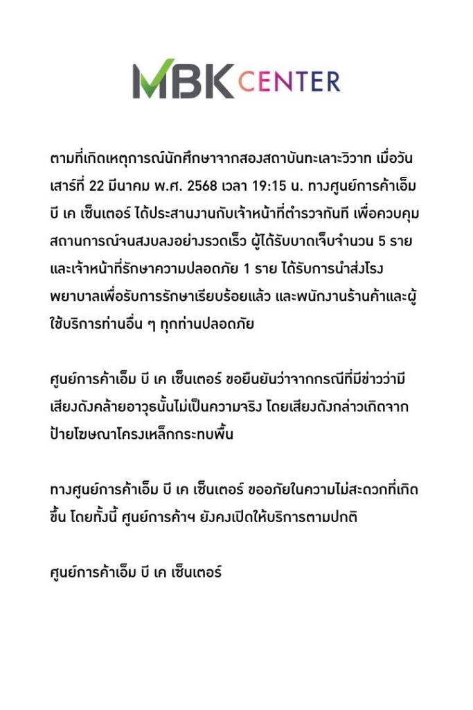 ศูนย์การค้าเอ็ม บี เค เซ็นเตอร์ ขอยืนยันว่า มีมาตรการตรวจสอบอาวุธอย่างเข้มงวด และจากกรณีมีข่าวมีเสียงดังคล้ายอาวุธนั้นไม่เป็นความจริง โดยเสียงดังกล่าวเกิดจากป้ายโฆษณาโครงเหล็กกระทบพื้นทางศูนย์การค้าเอ็ม บี เค เซ็นเตอร์ ขออภัยในความไม่สะดวกที่เกิดขึ้น และขอยืนยันว่า ศูนย์การค้ายังคงเปิดให้บริการตามปกติศูนย์การค้าเอ็ม บี เค เซ็นเตอร์”