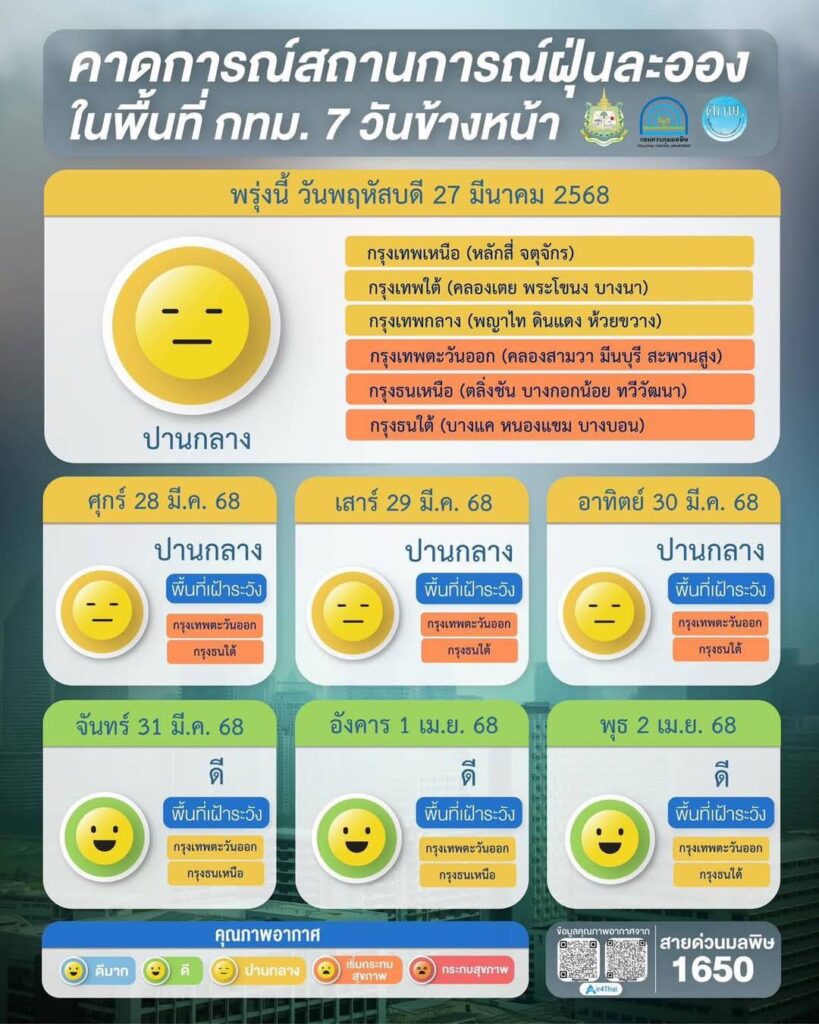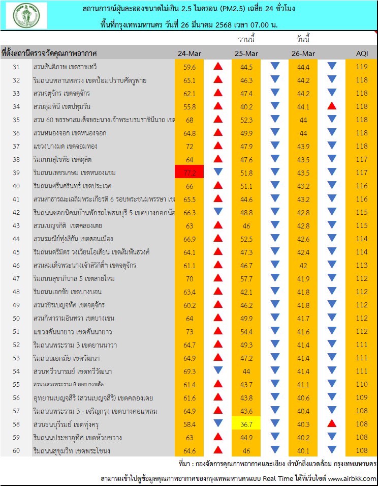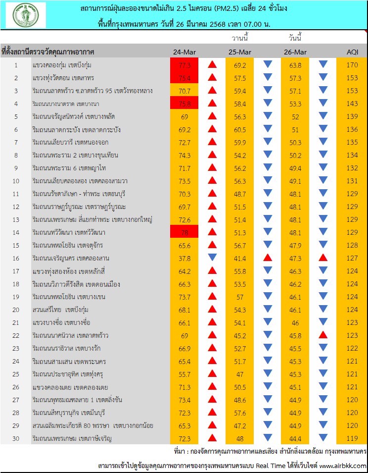 ศูนย์ข้อมูลคุณภาพอากาศกรุงเทพมหานครขอรายงานสถานการณ์ฝุ่นละอองขนาดไม่เกิน 2.5 ไมครอน (PM 2.5) ของสถานีตรวจวัดคุณภาพอากาศของกรุงเทพมหานคร ประจำวันพุธที่ 26 มีนาคม พ.ศ. 2568 เวลา 07.00 น. ค่าเฉลี่ย 24 ชั่วโมง ของฝุ่นละอองขนาดไม่เกิน 2.5 ไมครอน (PM2.5)