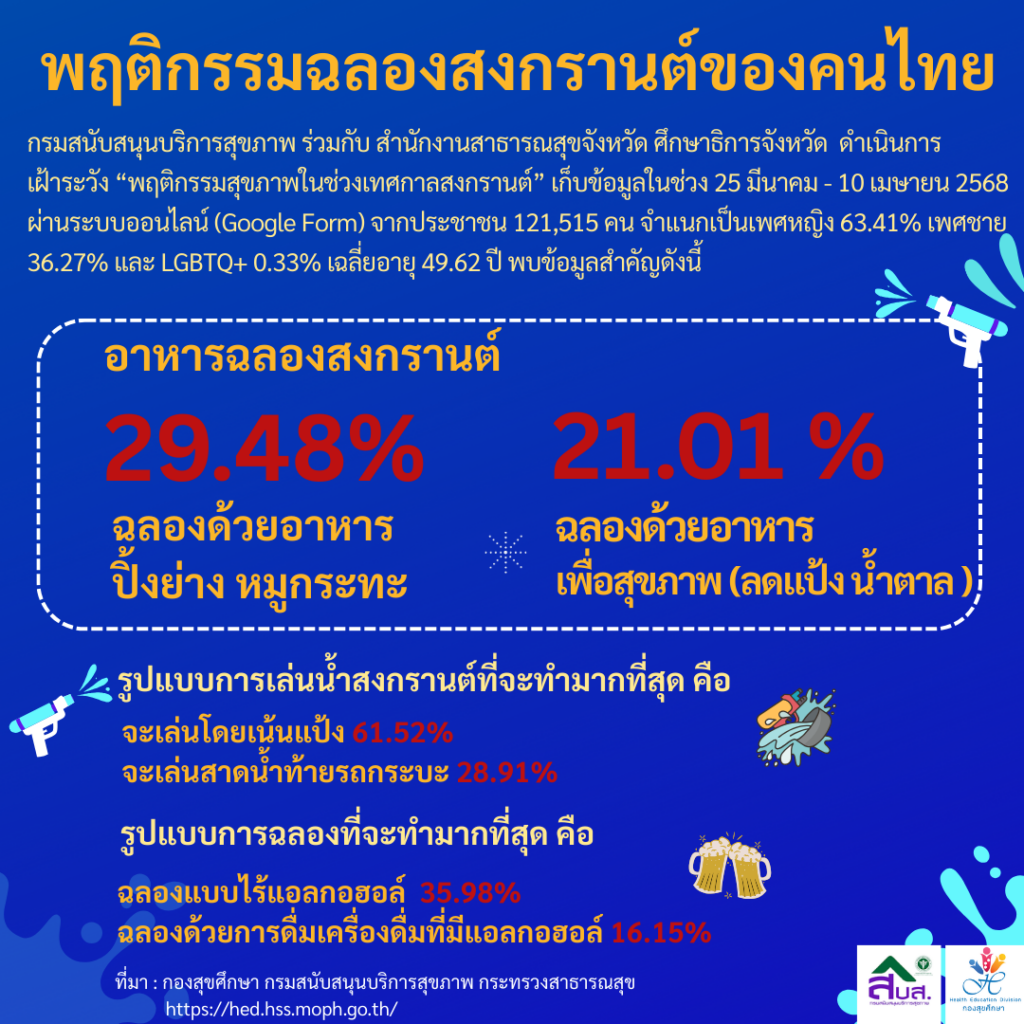 กรม สบส.จึงร่วมกับ สำนักงานสาธารณสุขจังหวัด ศึกษาธิการจังหวัด ศูนย์สนับสนุนบริการสุขภาพที่ 1 – 12 เก็บข้อมูล “พฤติกรรมที่อาจทำให้เกิดความเสี่ยงด้านสุขภาพในช่วงเทศกาลสงกรานต์” ระหว่างวันที่ 25 มีนาคม – 10 เมษายน 2568 จากประชาชน 121,515 คน โดยพบข้อมูลดังนี้