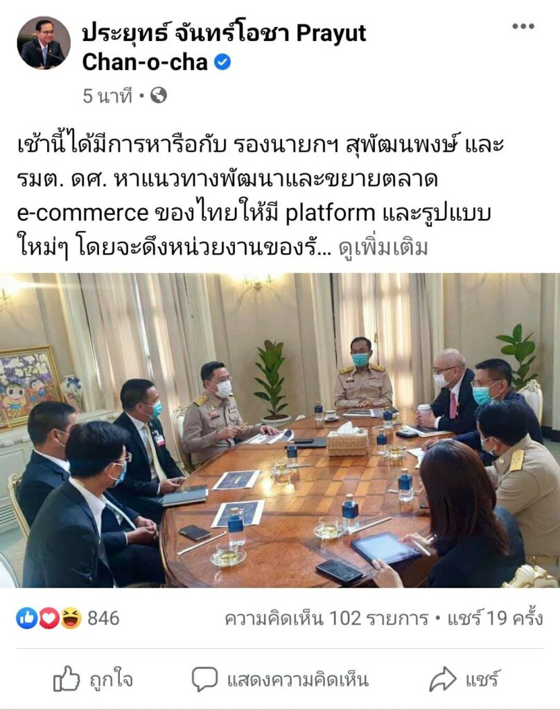 พล.อ.ประยุทธ์ จันทร์โอชา นายกรัฐมนตรีและรัฐมนตรีว่าการกระทรวงกลาโหม โพสต์ข้อความผ่านเพจเฟซบุ๊ก “ประยุทธ์ จันทร์โอชา Prayut Chan-o-cha” โดยมีข้อความว่า “เช้านี้ได้มีการหารือกับ นายสุพัฒนพงษ์ พันธ์มีเชาว์ รองนายกรัฐมนตรีและรัฐมนตรีว่าการกระทรวงพลังงาน นายพุทธิพงษ์ ปุณณกันต์ รัฐมนตรีว่าการกระทรวงดิจิทัลเพื่อเศรษฐกิจและสังคม หาแนวทางพัฒนาและขยายตลาด e-commerce ของไทยให้มี platform และรูปแบบใหม่ๆ โดยจะดึงหน่วยงานของรัฐ และภาคเอกชนมารวมกันเพื่อสนับสนุน start-ups และ SMEs ของไทยให้แข็งแกร่งยิ่งขี้นครับ”