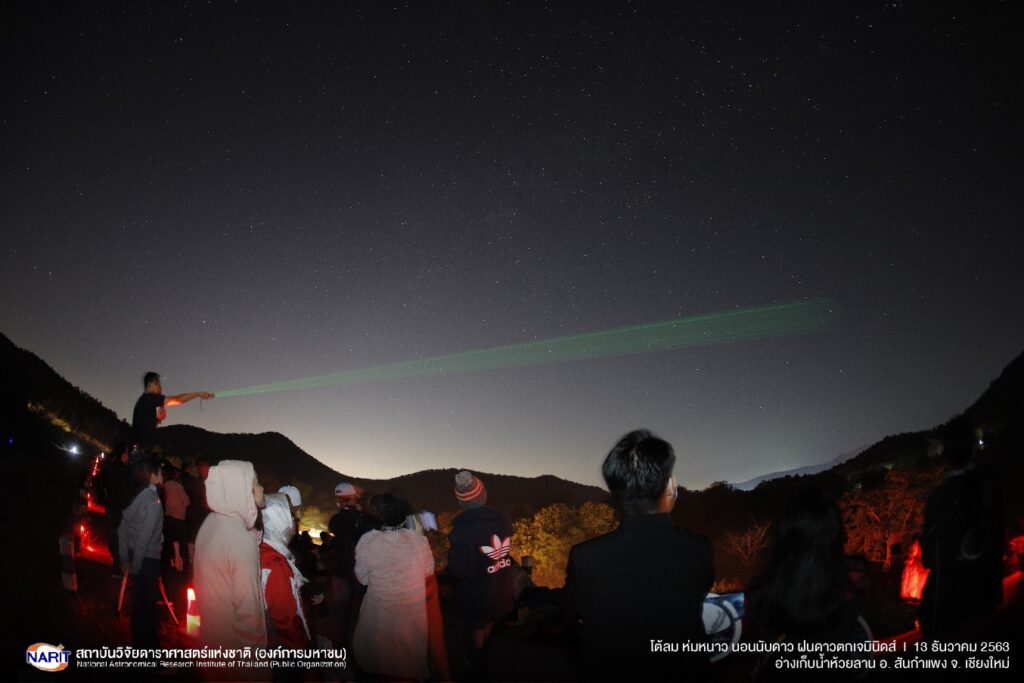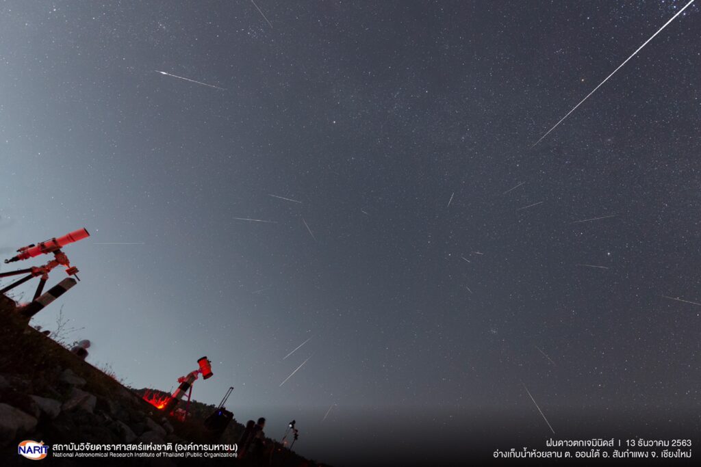 สถาบันวิจัยดาราศาสตร์แห่งชาติ (องค์การมหาชน) (สดร.) กระทรวงการอุดมศึกษา วิทยาศาสตร์ วิจัยและนวัตกรรม เผยภาพ “ฝนดาวตกเจมินิดส์”เหนืออ่างเก็บน้ำห้วยลาน ต.ออนใต้ อ.สันกำแพง จ.เชียงใหม่ คืนวันที่ 13 ถึง รุ่งเช้า 14 ธันวาคม 2563 บันทึกในช่วงเวลาประมาณ 21:00 – 02:30 น. นับเป็นฝนดาวตกส่งท้ายปีนี้อัตราการตกเฉลี่ยสูงสุดเป็นไปตามคาด มากถึงประมาณ 150 ดวงต่อชั่วโมง สามารถสังเกตเห็นดาวตกที่เป็นลูกไฟ (Fireball) และดาวตกชนิดระเบิด (Bolide) เป็นแนวยาวพาดผ่านท้องฟ้า ทั้งนี้สดร. ได้จัดกิจกรรม “โต้ลม ห่มหนาว นอนนับดาว…ฝนดาวตกเจมินิดส์” คืน 13 – รุ่งเช้า 14 ธันวาคม 2563 ณ อ่างเก็บน้ำห้วยลาน ต.ออนใต้ อ.สันกำแพง จ.เชียงใหม่ ประชาชนมาร่วมชมกันคึกคักแต่หัวค่ำ ท่ามกลางอากาศหนาวเย็น ต่างจับจองพื้นที่รอชมฝนดาวตก และพากันส่องวัตถุท้องฟ้าผ่านกล้องโทรทรรศน์ อาทิ ดาวเสาร์ ดาวพฤหัสบดี กาแล็กซีแอนโดรเมดา เนบิวลานายพราน พร้อมฟังบรรยายการดูดาวเบื้องต้น ดาวตกดวงแรกปรากฏให้เห็นในเวลา 19:49 น. ลักษณะเป็นลูกไฟขนาดใหญ่พาดผ่านท้องฟ้าเรียกเสียงฮือฮาดังก้องทั่วบริเวณอ่างเก็บน้ำ จากนั้นมีดาวตกปรากฏให้เห็นอย่างต่อเนื่อง ประชาชนที่เฝ้ารอชมต่างส่งเสียงเฮกันเป็นระยะๆ เช่นเดียวกันกับที่หอดูดาวเฉลิมพระเกียรติ 7 รอบ พระชนมพรรษา นครราชสีมาและหอดูดาวเฉลิมพระเกียรติ 7 รอบ พระชนมพรรษา ฉะเชิงเทรา มีประชาชนสนใจมาร่วมชมกันอย่างคับคั่งเช่นกัน